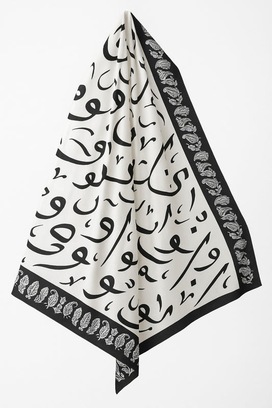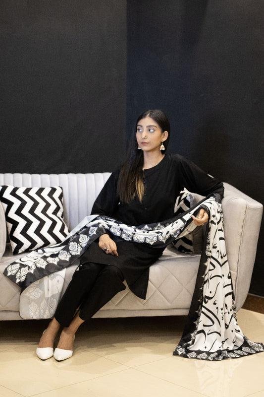 Three Piece Lawn Black Suit with Printed Calligraphy Dupatta